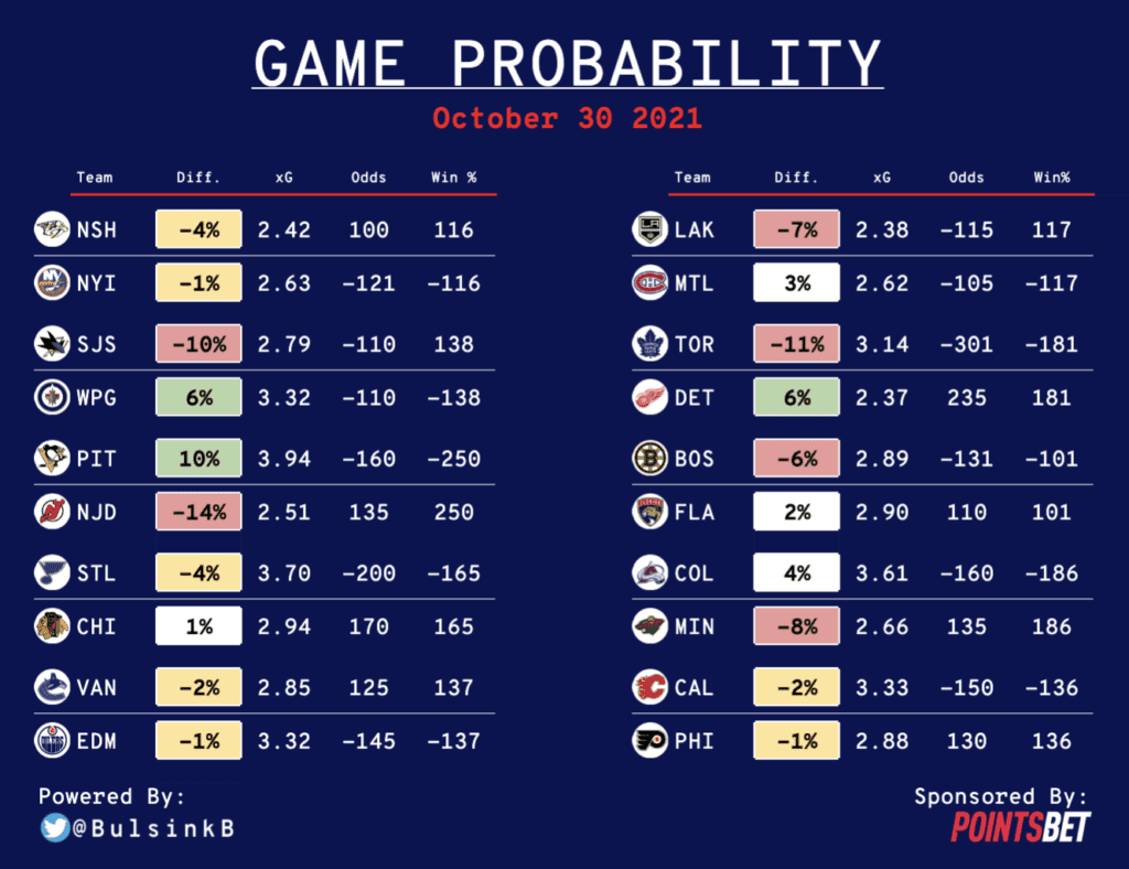 I have pushed back against the model a little bit when it comes to the Penguins because of all of their injuries. That will come to an end tonight with Sidney Crosby and Jeff Carter returning to the lineup. Without Jack Hughes, the Devils are 1-2-0 and have scored just six goals (2.0 GF/gm). With a lack of offence and a matchup vs. a Penguins team that leads the NHL in xGA/60 (1.84) does not set up well for New Jersey.