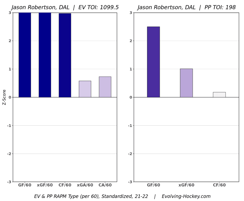 Along with great point totals, Robertson is also one of the best play-drivers in the league. He finished the 2021-22 season with a 55.84% shot attempt share and 59.63% expected goal share at even strength, a lot of that due to his offensive abilities, as he ranked 36th among forwards in shot attempts for per 60 minutes and 19th in expected goals for per 60 minutes. His defense isn’t quite as strong, but it’s passable and he more than makes up for it with his offense.