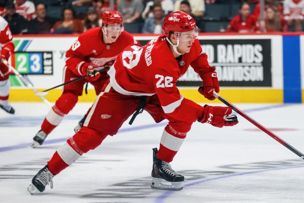 “He’s a very nice player,” Larkin said after the game. “He’s got some speed, young legs. Aside from that, he thinks the game very well. It was our second day with him, and I thought there was countless foot races won and puck battles won, and he’s smart to bump it to [Raymond] and I and know that we’re coming and we’re looking to get it back to him…He’s been impressive all camp.”