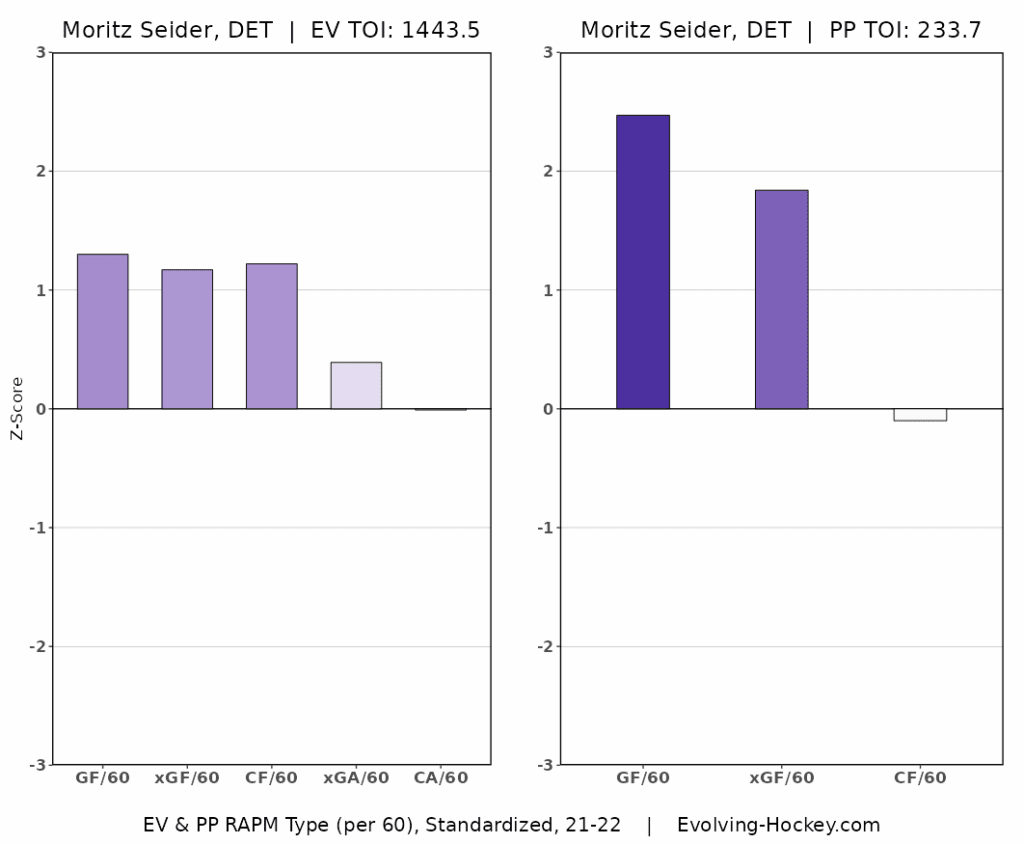 But the most impressive thing about Seider’s rookie season was how quickly he was handed tough assignments against top competition. According to Evolving Hockey’s Quality of Competition data, Seider typically faced opponents with a regularized adjust expected goal plus-minus per 60 minutes of +0.03 (which was tied for fifth among defensemen with 1,000 minutes played that season), and a goals above replacement plus-minus per 60 of +0.23 (which was tied for first).