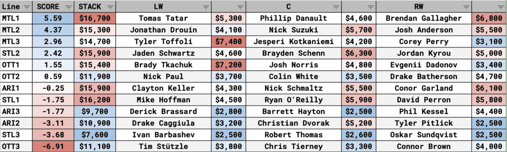 Once we have those numbers, they are compared to the stats of all the other lines on that slate to determine which lines are the best. A score of 0.00 would be average and the higher the 5v5 SCORE the better.