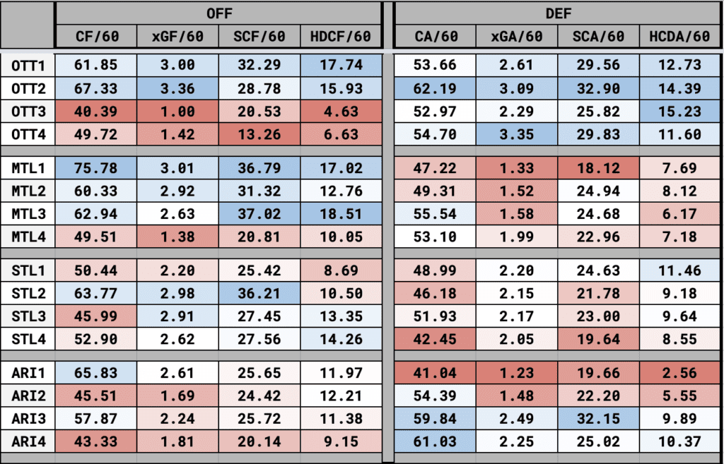 For example, we project that OTT3 (Stützle-Tierney-Brown) will play 71 percent of their 5v5 ice-time against MTL1 (Tatar-Danault-Gallagher). That will translate into 49 percent of MTL1s 5v5 TOI coming vs. OTT3. All of that TOI is simulated, using the stats below to give us an idea of how many Scoring Chances, High-Danger Chances and Expected Goals For each line will generate.