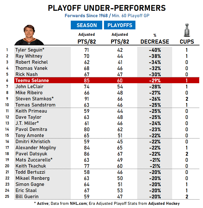 We’ll touch briefly on the post-expansion underachiever list. Teemu Selanne stands out as the only Hall of Famer, but some additional context is needed. Just 21 of Selanne’s 130 career playoff caps came in his 20s, so his post-season career is largely as an elder statesman rather than in his prime.