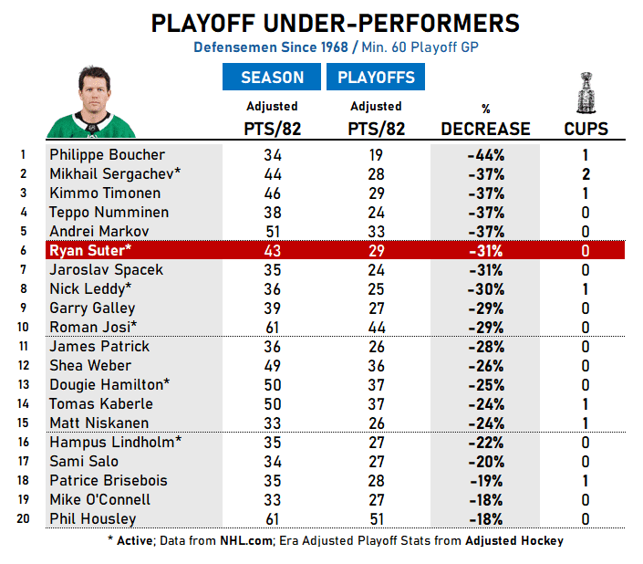 Seguin owns the #1 spot on the list by a significant margin, his output dropping a cringey 40% in the playoffs. Again, this is adjusted to playoff scoring climate, so it’s not a function of tighter games. Despite a Cup ring and 14 career rounds won, Seguin’s adjusted playoff line is: 20 goals, 39 assists, 59 points in 114 games. That’s 0.52 points per game. While he started young and battled serious injury, there’s really been no stretch where Seguin’s been a post-season performer. In Dallas’ 2020 run, he had just two goals in 26 games despite averaging 18+ minutes.
