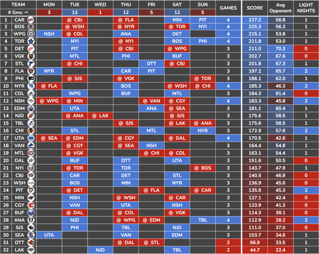 Look ahead and see if you have open forward slots on those days. If you do, use the Strength of Schedule to target players from teams with easy schedules and four games this week, such as Carolina, Boston, Winnipeg, and Toronto.
