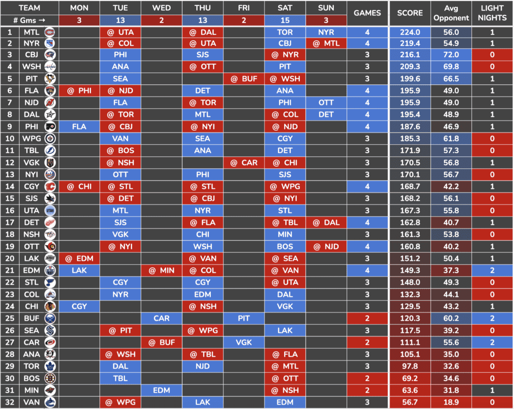 I combined that weekly schedule with a Team Defense Score I created using key defensive metrics to find which teams/skaters have the best schedule this week.