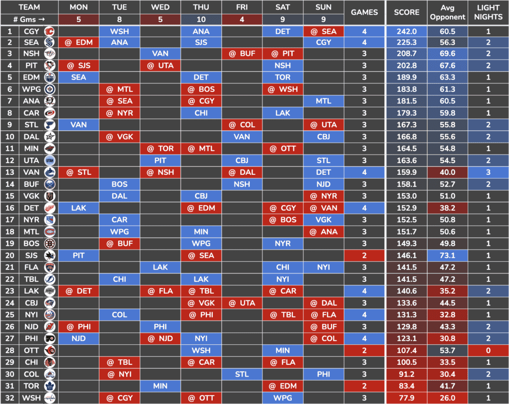 I combined that weekly schedule with a Team Defense Score I created using key defensive metrics to find which teams/skaters have the best schedule this week.