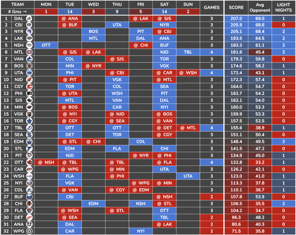 I combined that weekly schedule with a Team Defense Score I created using key defensive metrics to find which teams/skaters have the best schedule this week.