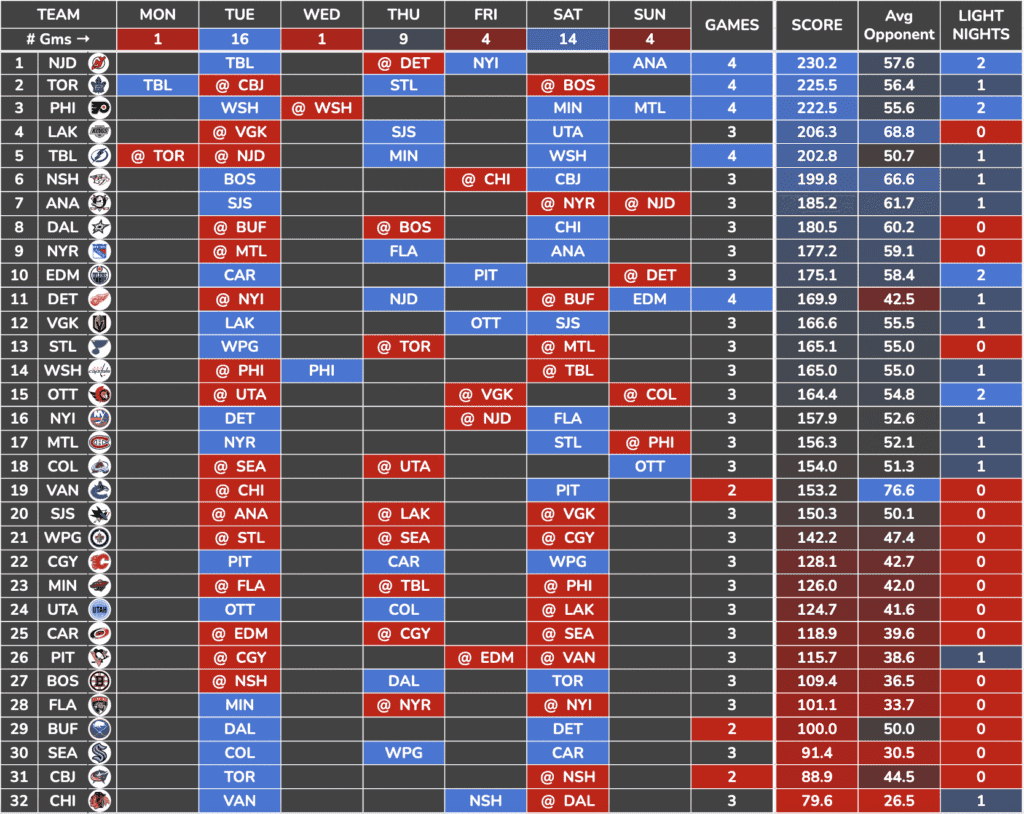I combined that weekly schedule with a Team Defense Score I created using key defensive metrics to find which teams/skaters have the best schedule this week.