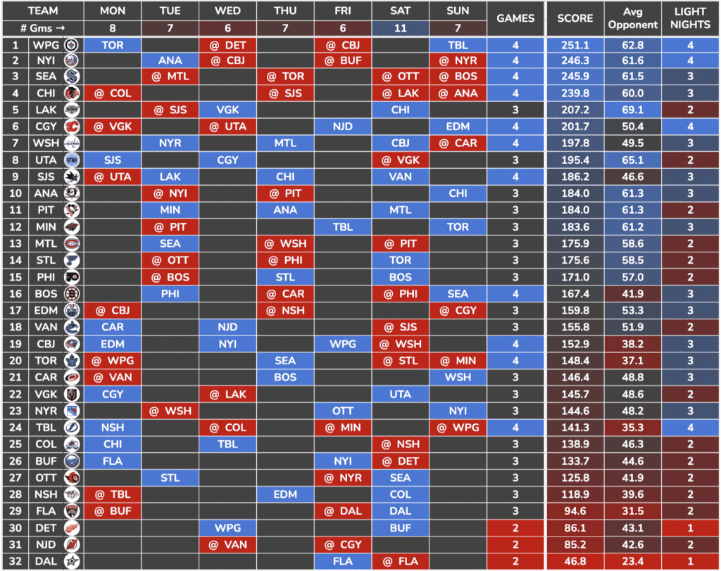 The Jets are one of 11 teams with four games this week but have the easiest overall schedule, mostly thanks to mid-week meetings with the Red Wings and Blue Jackets.