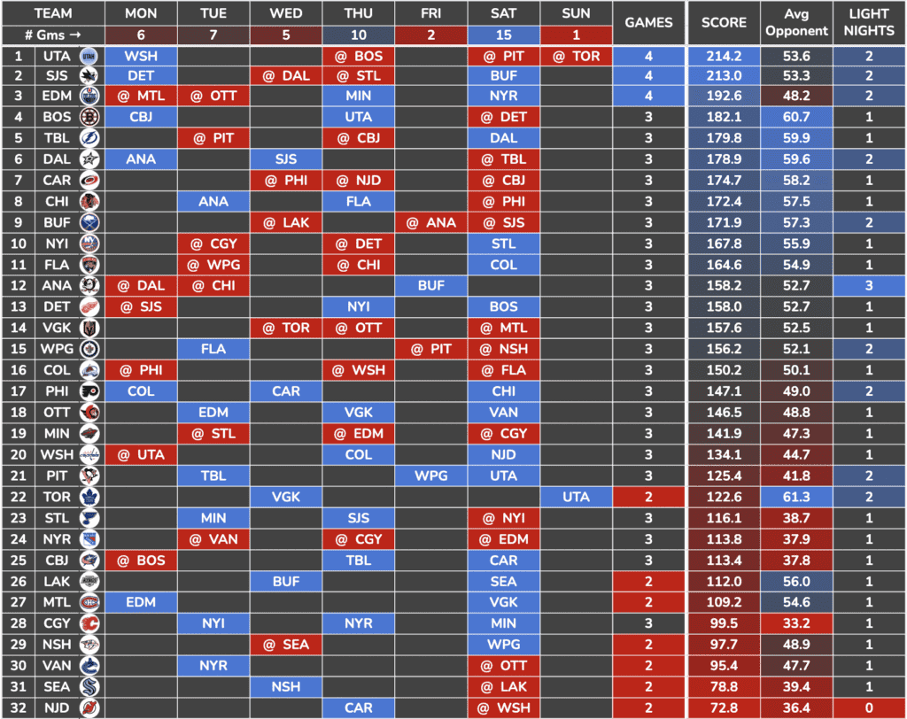 I combined that weekly schedule with a Team Defense Score I created using key defensive metrics to find which teams/skaters have the best schedule this week.
