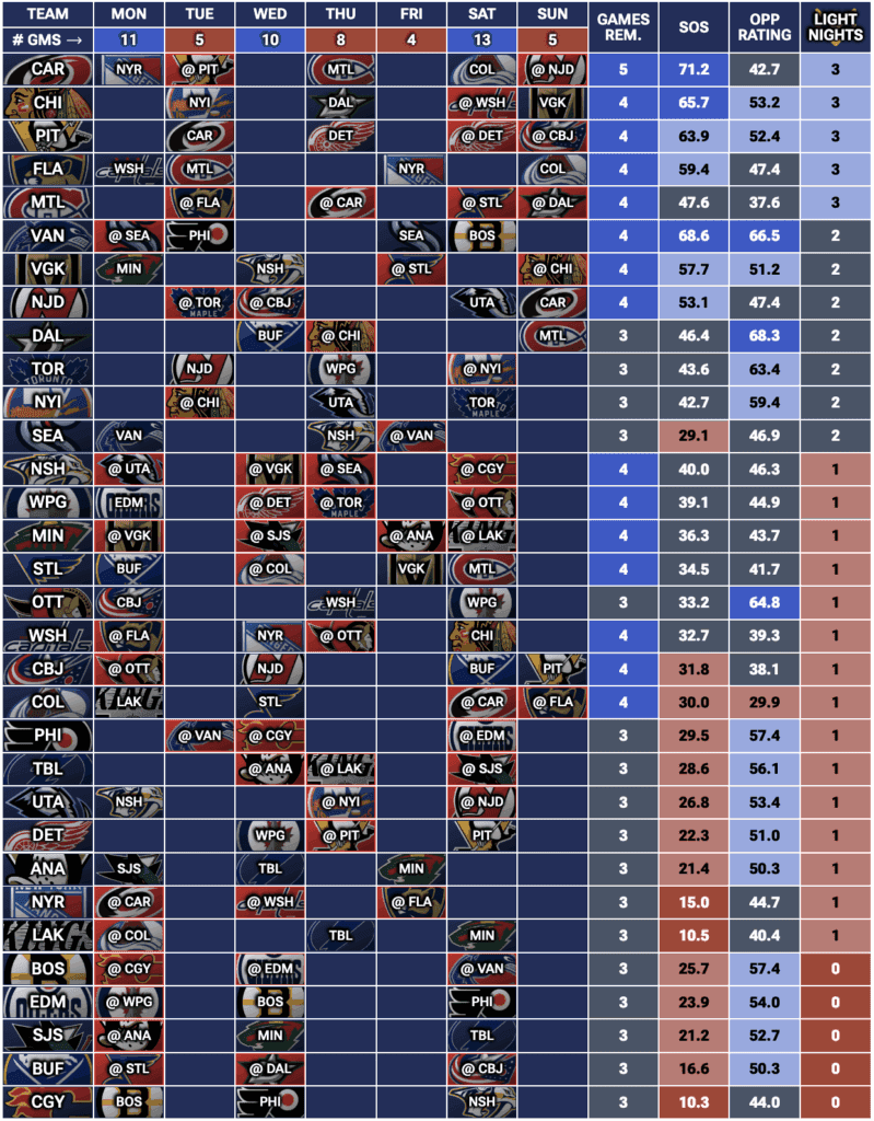If you’re looking for a full breakdown of every team’s upcoming schedule, check out our Fantasy Hockey Strength of Schedule Tool — updated daily to show which teams have the most games and valuable light-night matchups each week.