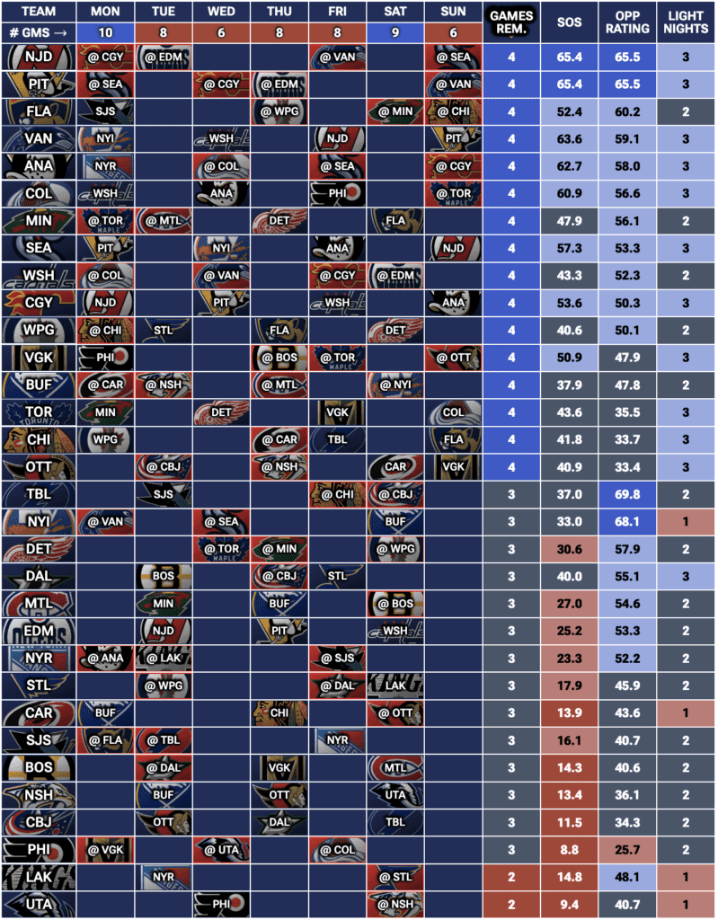 If you’re looking for a full breakdown of every team’s upcoming schedule, check out our Fantasy Hockey Strength of Schedule Tool — updated daily to show which teams have the most games and valuable light-night matchups each week.
