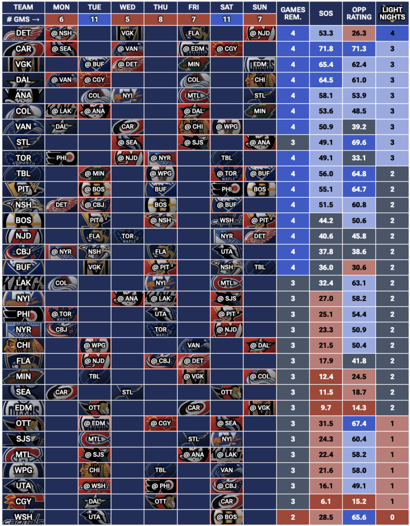 If you’re looking for a full breakdown of every team’s upcoming schedule, check out our Fantasy Hockey Strength of Schedule Tool — updated daily to show which teams have the most games and valuable light-night matchups each week.