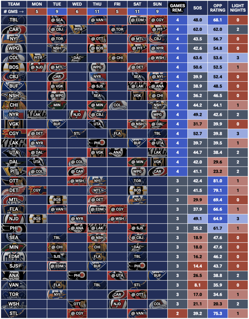 If you’re looking for a full breakdown of every team’s upcoming schedule, check out our Fantasy Hockey Strength of Schedule Tool — updated daily to show which teams have the most games and valuable light-night matchups each week.