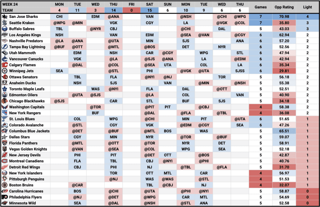 The Sharks are one of two teams with seven games during the extended Week 24—and the only team with four Light Night games. They also boast the best Average Opponent Rating in the NHL and offer plenty of viable streaming options. Simply put, they check every box and are the clear go-to streaming team this week.