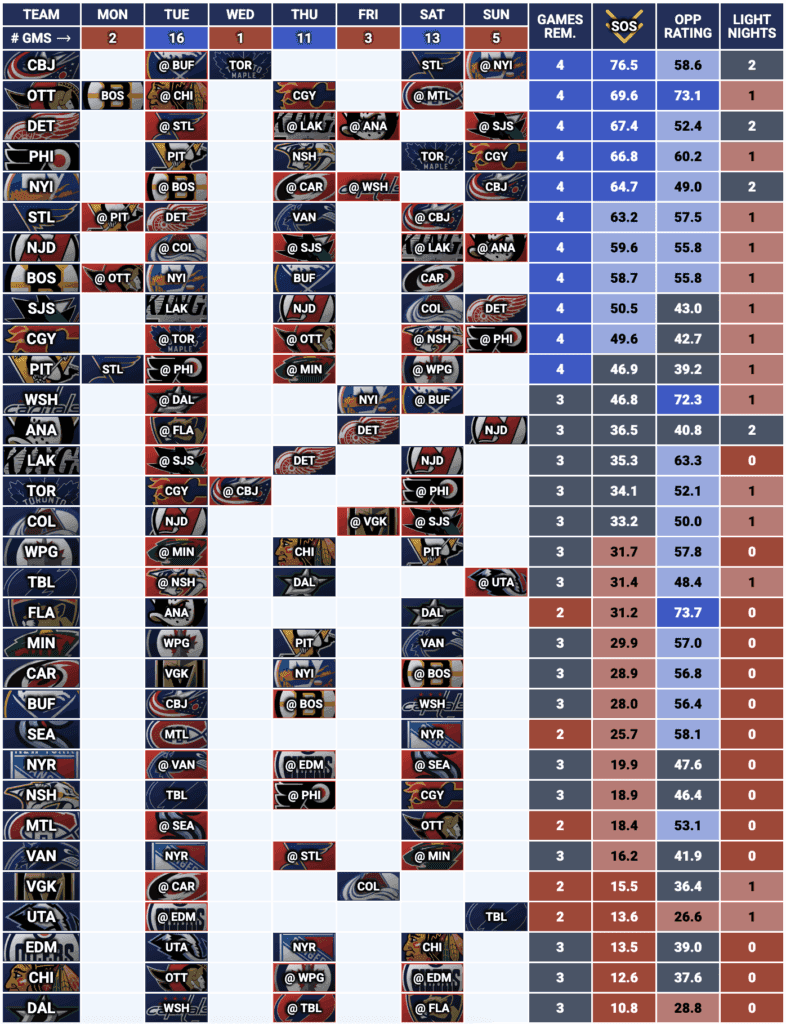 If you’re looking for a full breakdown of every team’s upcoming schedule, check out our Fantasy Hockey Strength of Schedule Tool — updated daily to show which teams have the most games and valuable light-night matchups each week.
