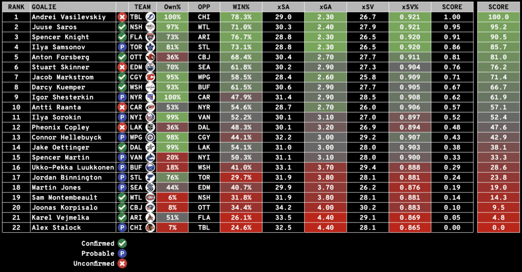 We here at DailyFaceoff try to make being a Fantasy Owner as easy as possible. Each day, we will rank the day’s starting goalies based on their Projected Win%, Goals Against Average, and SV%. Win percentage and expected goals against are generated from Sportsbooks Odds and Implied Totals.