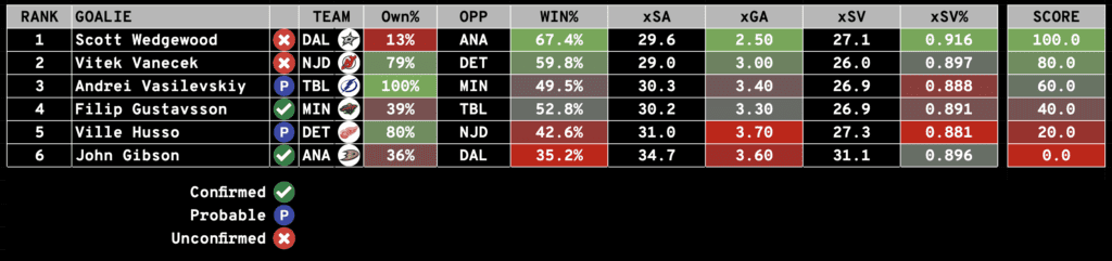 Keep an eye on our Starting Goalies page to ensure the goals listed below are CONFIRMED to start.