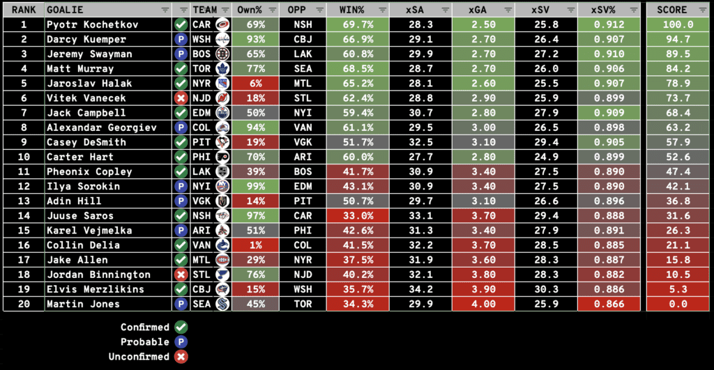 We here at DailyFaceoff try to make being a Fantasy Owner as easy as possible. Each day, we will rank the day’s starting goalies based on their Projected Win%, Goals Against Average, and SV%. Win percentage and expected goals against are generated from Sportsbooks Odds and Implied Totals.