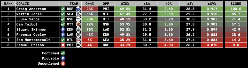 Keep an eye on our Starting Goalies page to ensure the goals listed below are CONFIRMED to start.
