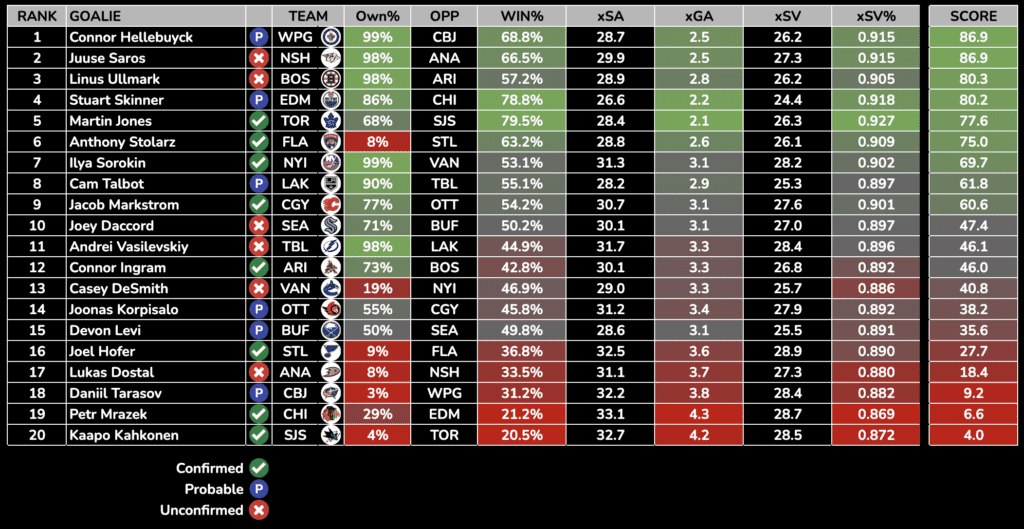 Each day, we will rank the day’s starting goalies based on their Projected Win%, Goals Against Average, and SV%. Win percentage and expected goals against is generated from Sportsbooks Odds and Implied Totals.