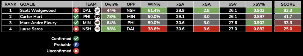 Each day, we will rank the day’s starting goalies based on their Projected Win%, Goals Against Average, and SV%. Win percentage and expected goals against is generated from Sportsbooks Odds and Implied Totals.