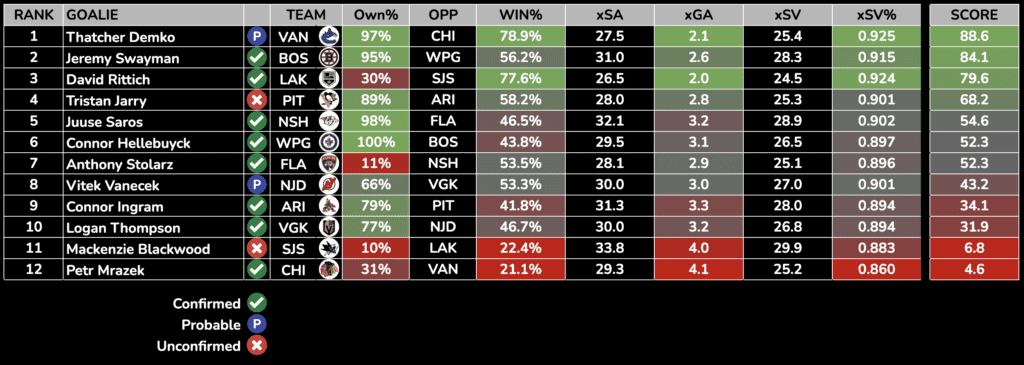 Each day, we will rank the day’s starting goalies based on their Projected Win%, Goals Against Average, and SV%. Win percentage and expected goals against is generated from Sportsbooks Odds and Implied Totals.