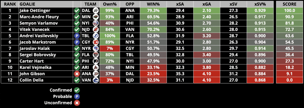 We here at DailyFaceoff try to make being a Fantasy Owner as easy as possible. Each day, we will rank the day’s starting goalies based on their Projected Win%, Goals Against Average, and SV%. Win percentage and expected goals against are generated from Sportsbooks Odds and Implied Totals.