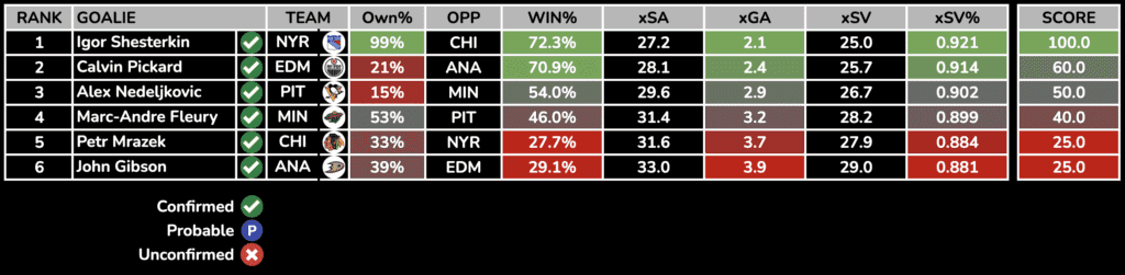 Each day, we will rank the day’s starting goalies based on their Projected Win%, Goals Against Average, and SV%. Win percentage and expected goals against is generated from Sportsbooks Odds and Implied Totals.