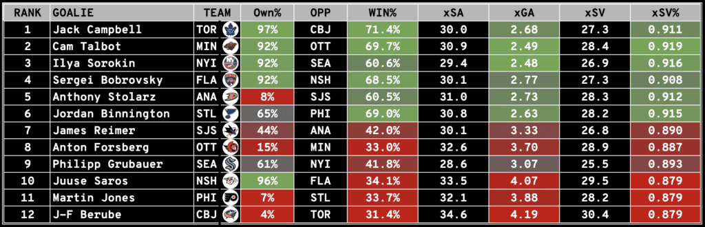 Each day, we will rank the day’s starting goalies based on their Projected Win%, Goals Against Average, and SV%. Win percentage and expected goals against is generated from Sportsbooks Odds and Implied Totals.