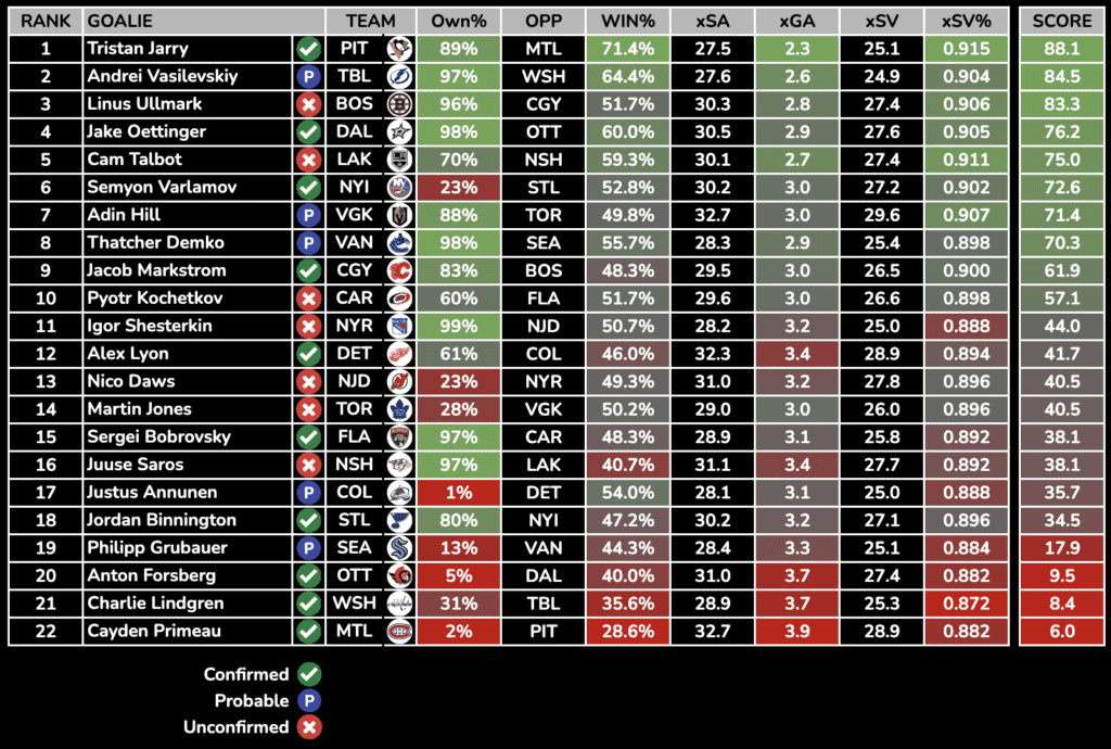 Each day, we will rank the day’s starting goalies based on their Projected Win%, Goals Against Average, and SV%. Win percentage and expected goals against is generated from Sportsbooks Odds and Implied Totals.