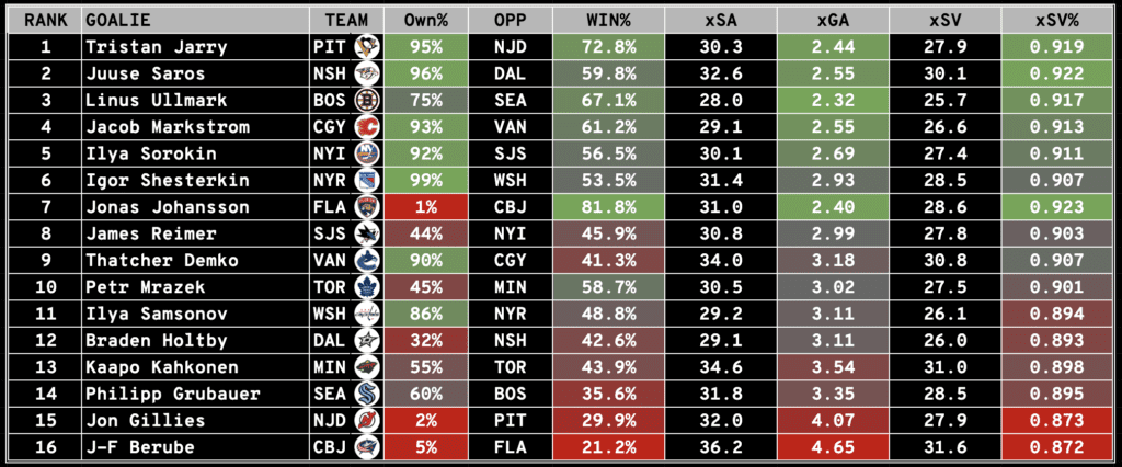 Each day, we will rank the day’s starting goalies based on their Projected Win%, Goals Against Average, and SV%. Win percentage and expected goals against is generated from Sportsbooks Odds and Implied Totals.