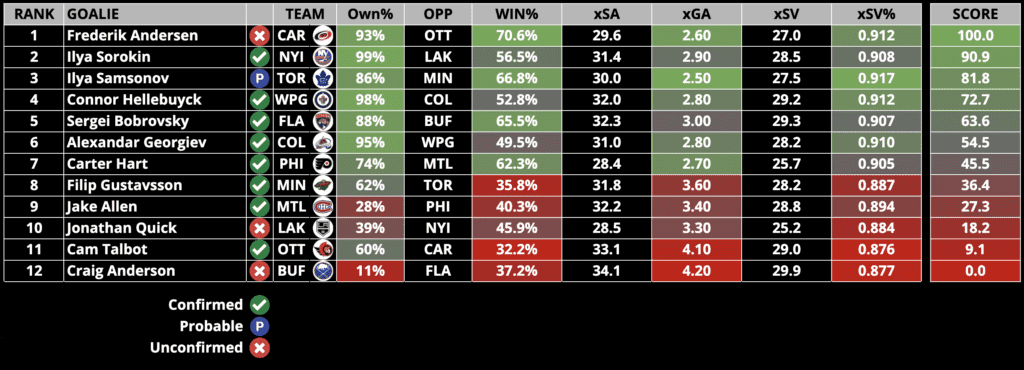 We here at DailyFaceoff try to make being a Fantasy Owner as easy as possible. Each day, we will rank the day’s starting goalies based on their Projected Win%, Goals Against Average, and SV%. Win percentage and expected goals against are generated from Sportsbooks Odds and Implied Totals.
