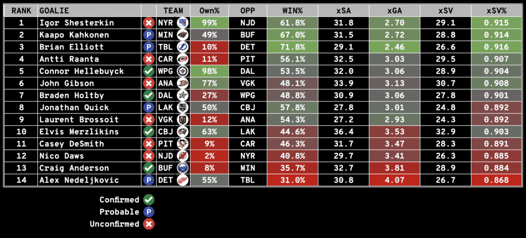 Each day, we will rank the day’s starting goalies based on their Projected Win%, Goals Against Average, and SV%. Win percentage and expected goals against is generated from Sportsbooks Odds and Implied Totals.
