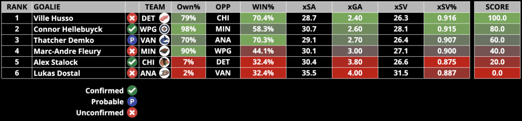 We here at DailyFaceoff try to make being a Fantasy Owner as easy as possible. Each day, we will rank the day’s starting goalies based on their Projected Win%, Goals Against Average, and SV%. Win percentage and expected goals against are generated from Sportsbooks Odds and Implied Totals.