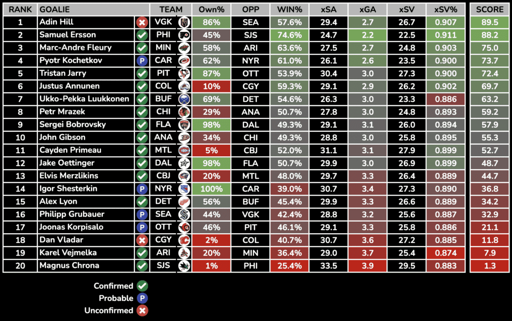 Each day, we will rank the day’s starting goalies based on their Projected Win%, Goals Against Average, and SV%. Win percentage and expected goals against is generated from Sportsbooks Odds and Implied Totals.