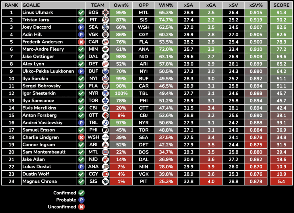 Each day, we will rank the day’s starting goalies based on their Projected Win%, Goals Against Average, and SV%. Win percentage and expected goals against is generated from Sportsbooks Odds and Implied Totals.