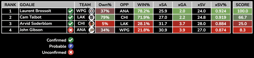Each day, we will rank the day’s starting goalies based on their Projected Win%, Goals Against Average, and SV%. Win percentage and expected goals against is generated from Sportsbooks Odds and Implied Totals.