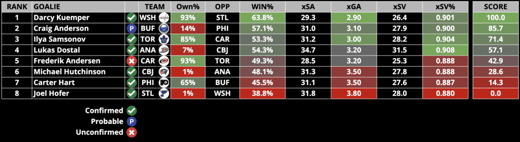 We here at DailyFaceoff try to make being a Fantasy Owner as easy as possible. Each day, we will rank the day’s starting goalies based on their Projected Win%, Goals Against Average, and SV%. Win percentage and expected goals against are generated from Sportsbooks Odds and Implied Totals.