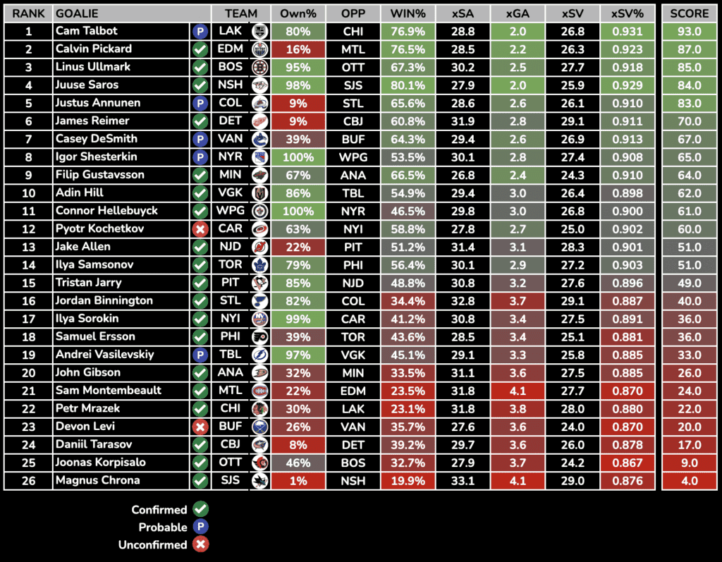 Each day, we will rank the day’s starting goalies based on their Projected Win%, Goals Against Average, and SV%. Win percentage and expected goals against is generated from Sportsbooks Odds and Implied Totals.