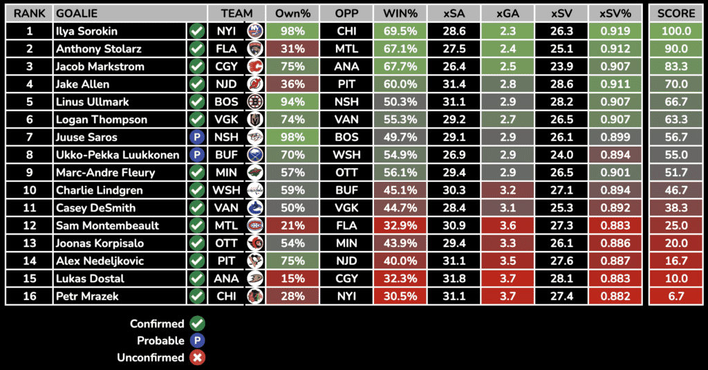 Each day, we will rank the day’s starting goalies based on their Projected Win%, Goals Against Average, and SV%. Win percentage and expected goals against is generated from Sportsbooks Odds and Implied Totals.