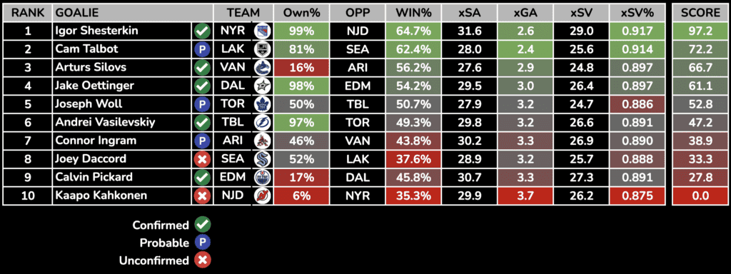 Each day, we will rank the day’s starting goalies based on their Projected Win%, Goals Against Average, and SV%. Win percentage and expected goals against is generated from Sportsbooks Odds and Implied Totals.