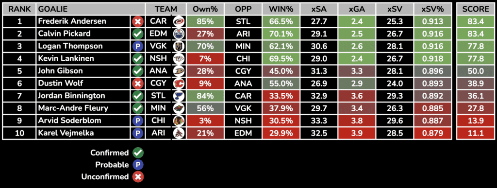 Each day, we will rank the day’s starting goalies based on their Projected Win%, Goals Against Average, and SV%. Win percentage and expected goals against is generated from Sportsbooks Odds and Implied Totals.
