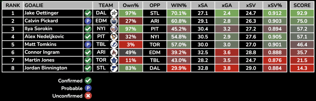 Each day, we will rank the day’s starting goalies based on their Projected Win%, Goals Against Average, and SV%. Win percentage and expected goals against is generated from Sportsbooks Odds and Implied Totals.