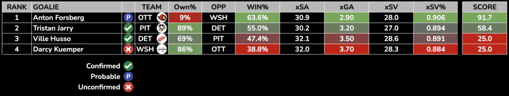 Each day, we will rank the day’s starting goalies based on their Projected Win%, Goals Against Average, and SV%. Win percentage and expected goals against is generated from Sportsbooks Odds and Implied Totals.