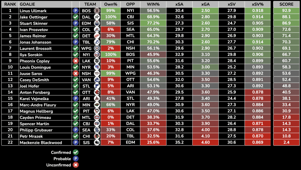 Each day, we will rank the day’s starting goalies based on their Projected Win%, Goals Against Average, and SV%. Win percentage and expected goals against is generated from Sportsbooks Odds and Implied Totals.