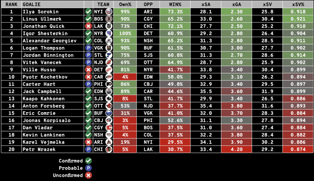 Keep an eye on our Starting Goalies page to ensure the goals listed below are CONFIRMED to start.