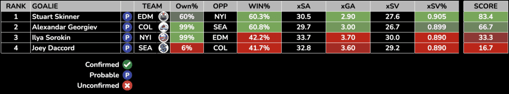 Each day, we will rank the day’s starting goalies based on their Projected Win%, Goals Against Average, and SV%. Win percentage and expected goals against is generated from Sportsbooks Odds and Implied Totals.