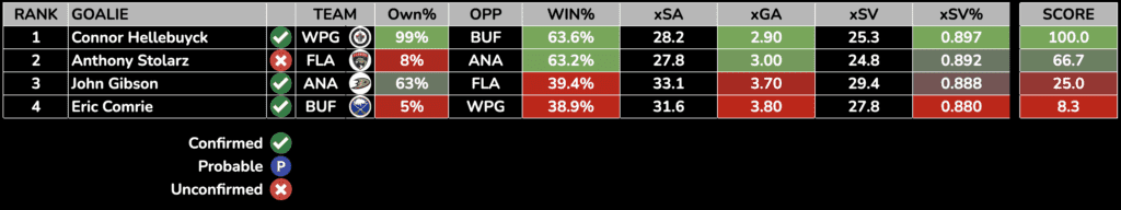 Each day, we will rank the day’s starting goalies based on their Projected Win%, Goals Against Average, and SV%. Win percentage and expected goals against is generated from Sportsbooks Odds and Implied Totals.